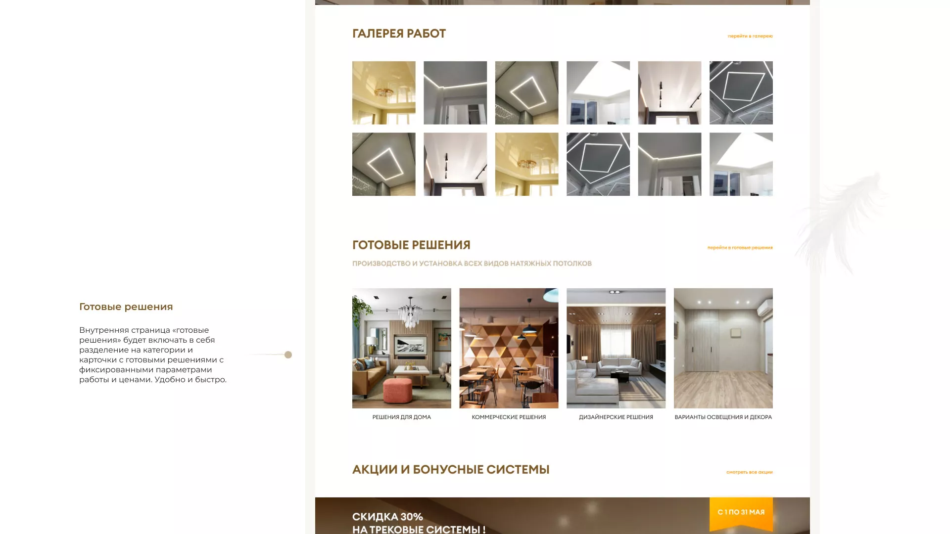 Что мы сделали. Разработали сайт в теплых и уютных «шоколадных» тонах. Продумали структуру, наполнили ее удобными разделами такими как «готовые решения», которые включают в себя не только уже готовые варианты с фиксированной ценой, но и разделение по категориям: решения для дома, коммерческих помещений, интересные дизайнерские решения. Так же предложили клиенту онлайн-калькулятор, что может существенно упростить потенциальным заказчикам нашего клиента в Кировске заказ потолков.